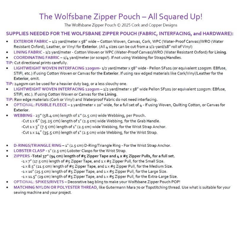 Recommended Fabric: outer - Cotton Woven, Canvas, Cork, Water-Proof Canvas/Water Resistant Oxford, Leather, or Vinyl. Lining - Cotton Woven, WPC/WRO. Additional supplies include lightweight woven interfacing if using cotton woven for exterior/lining, webbing for wrist strap/anchor/grab handle, zippers & pulls (see image for details)